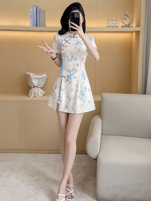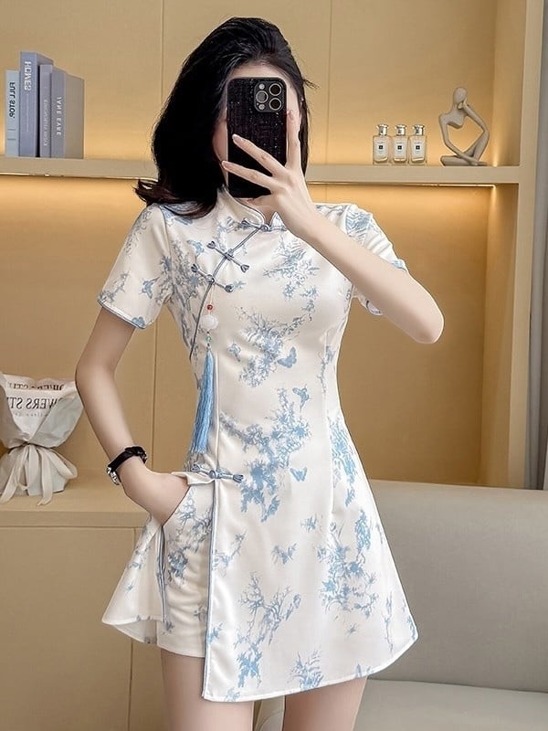 モダンチャイナ風ミニ丈ドレスです。 タッセルとチャイナボタンがアクセント。内側がショートパンツ仕様で安心して着られます! デートやお出かけで主役になれる一着、ぜひ試してみてくださいね
