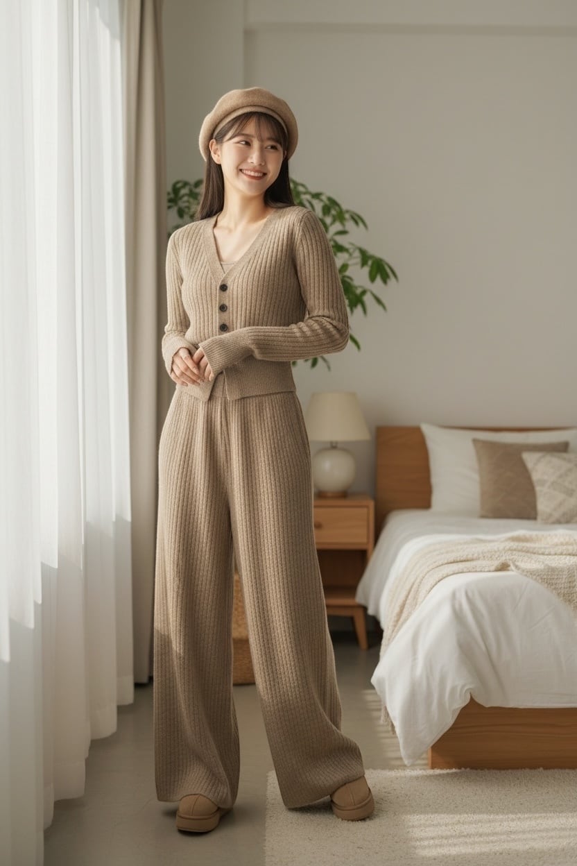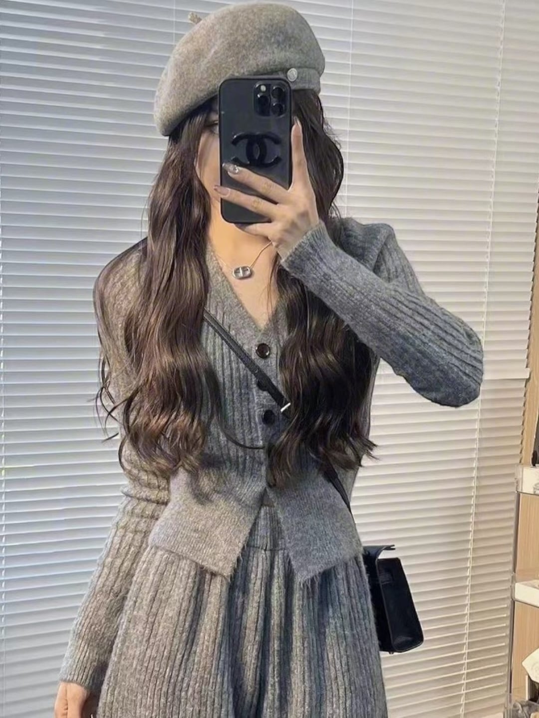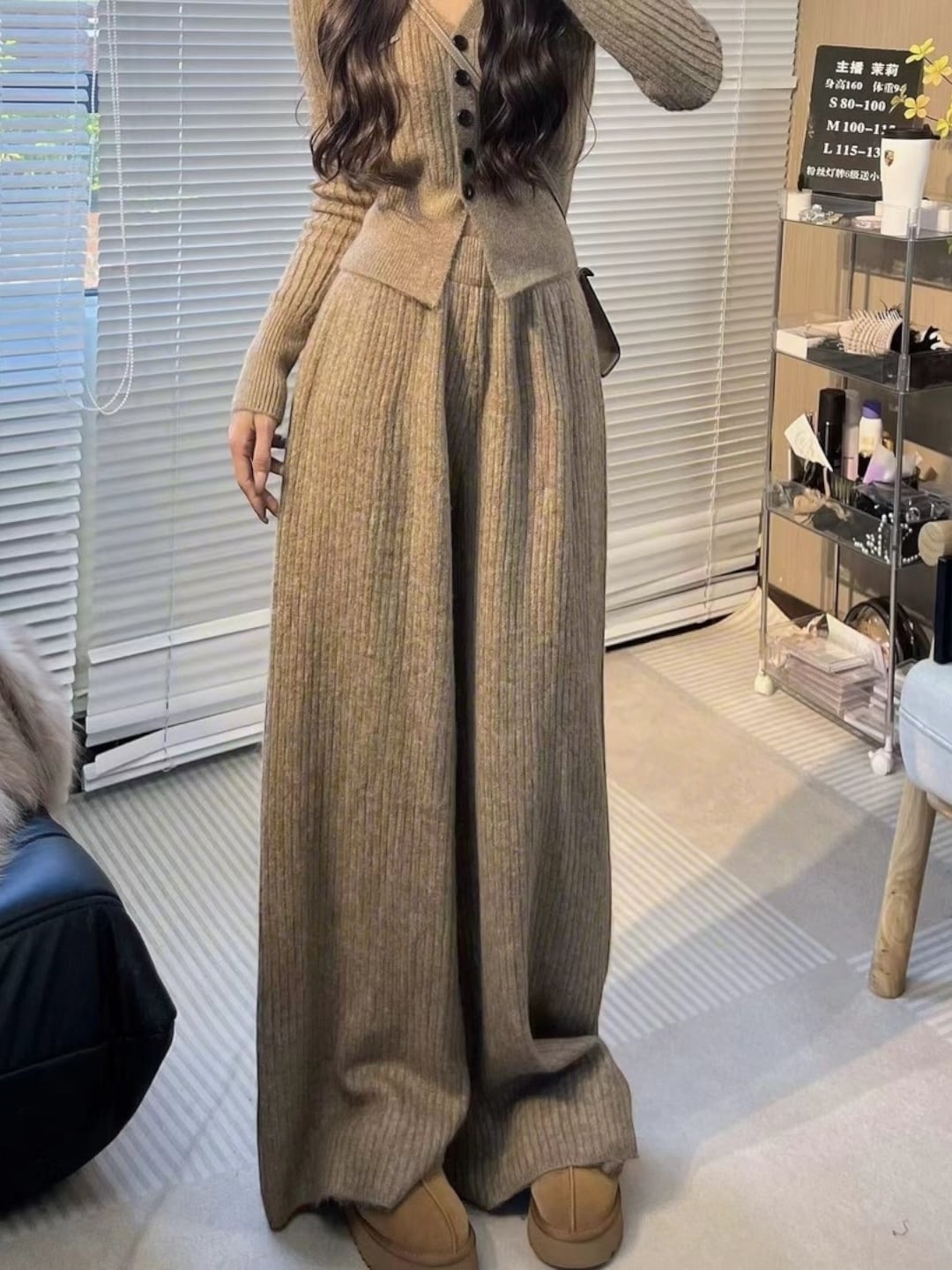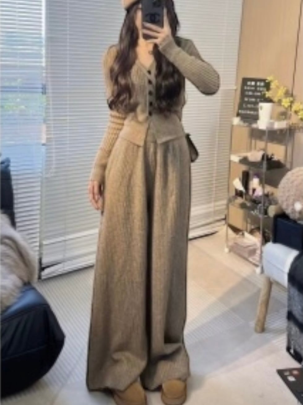 ショート丈のVネックカーデと、超ハイウエストのワイドパンツの組み合わせが、脚を驚くほど長く見せます! セットではもちろん、別々にも着回しが効く、秋冬のワードローブに欠かせないアイテムです。