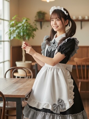 王道の可愛さにひとさじの遊び心をプラス!ネコ耳カチューシャとギンガムチェックのフリルがキュートな、甘くてクラシカルなメイドスタイル。袖とエプロンのたっぷりフリルでドールのような愛らしさを演出します。イベントや撮影会、もちろん普段使いの私服としてもおすすめです。