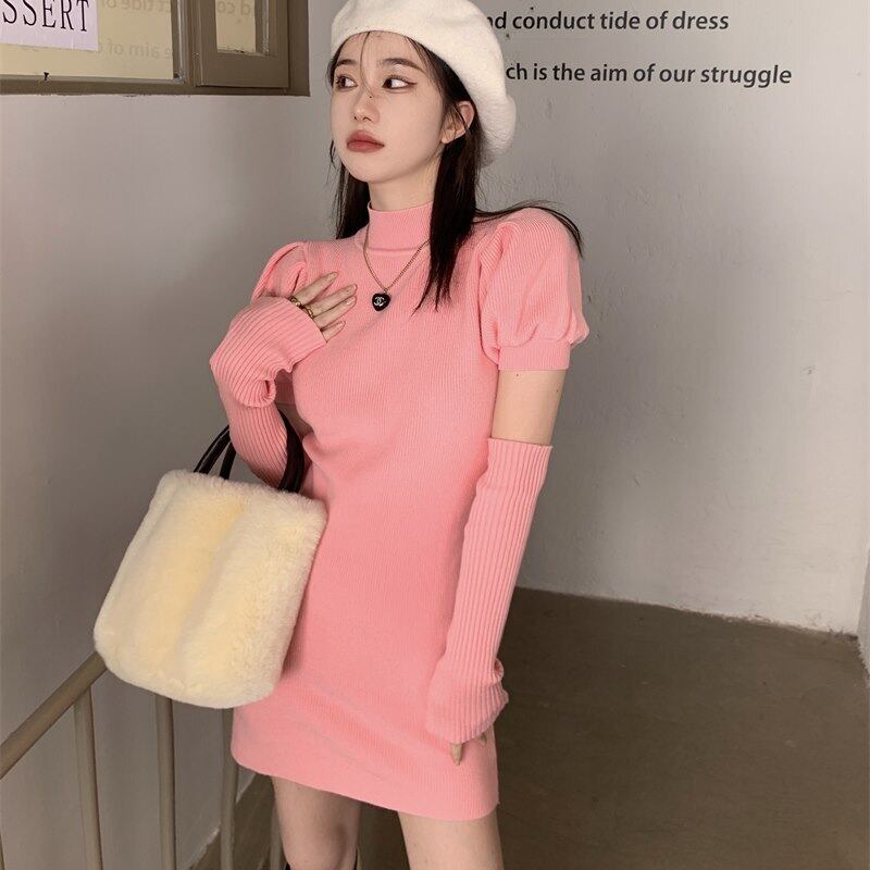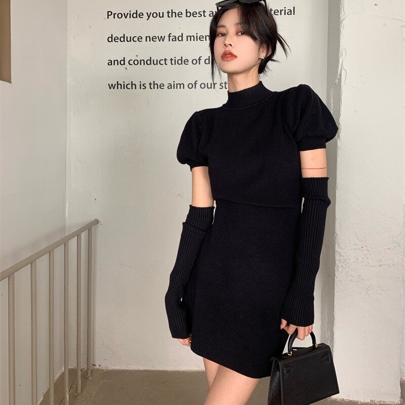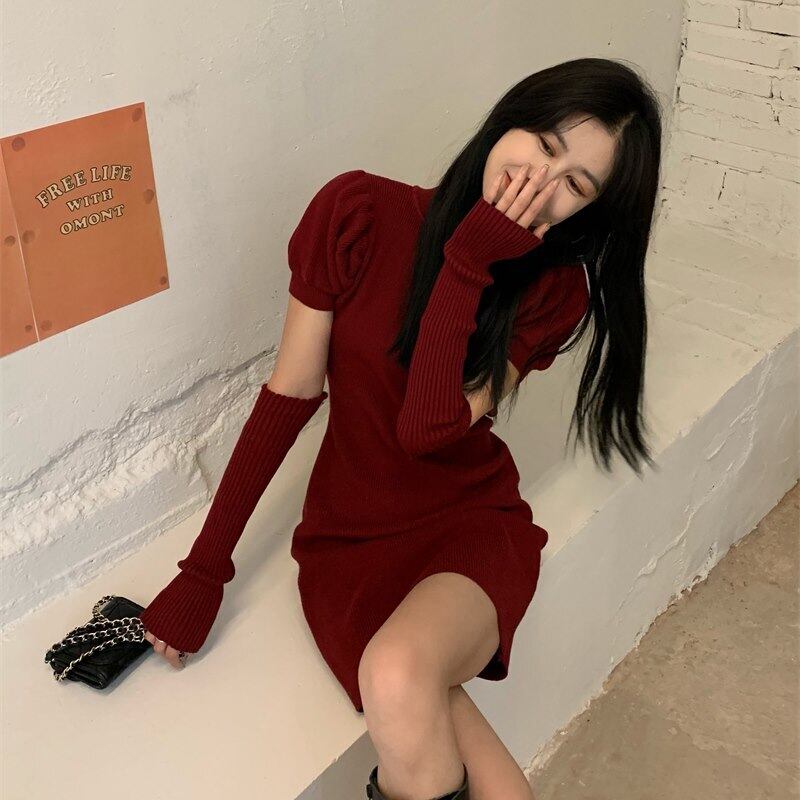 ミニ丈のニットワンピとアームウォーマーのセットアイテムです。